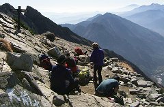 これまた凄そうな名前の重太郎新道。その通り、急勾配の下りが続きます。前半に、写真の長い鎖があります。疲れているため、このルートで命を落とす人もいるので十分慎重に下ります。「雷鳥の踊り場」と呼ばれる場所で、眼下の上高地や乗鞍を見ながら腰をおろして休憩です。