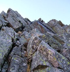 いきなりハシゴのある急斜面です。起き抜けに3000mの高度で酸素が薄く、深呼吸しても空気が入ってこない感じです。十分に慎重に20分ほど登ると、上級者用コースの西穂高岳方面の「ジャンダルム」「ロバの耳」などが見えて来て、傾斜も楽になります。