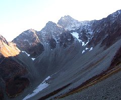 カールには、このまま万年雪となる去年の雪が、その上の奥穂高岳には今年降った雪が少し見えます。