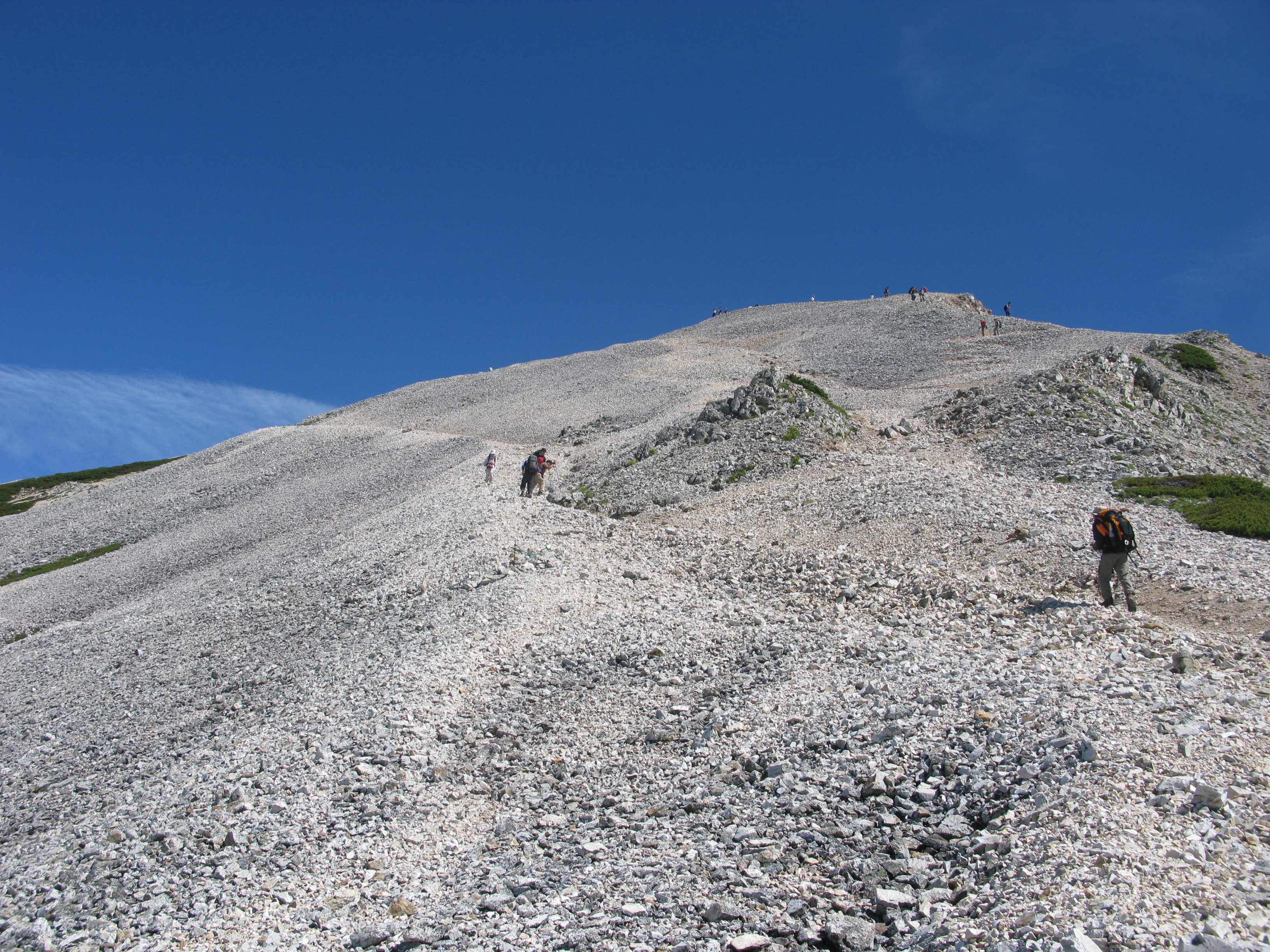 2時間の大雪渓を越えたら、あとは石がゴロゴロしている足場の悪い道を登ります。