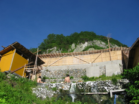 雪渓~鎖場 足場の悪い道を下りながら、ようやく鑓温泉小屋に到着です。