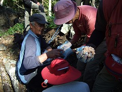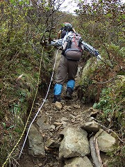 登山道は良く整備されています。徳本峠小屋の方や仲間が草を刈ったりしています。霞沢の源頭(げんとう:沢の源流部。水流がとだえてから稜線にいたる地帯。)は侵食されているので登山道をずらすように草刈をしてくれたそうです。安全に登れるのにはこんな努力もあるのです。感謝!!