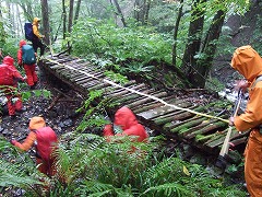 力水から20分ほど下った辺りから道の状況が険しくなります。沢を渡る橋などは良く出来ているとは思うのですが、雨に濡れると滑りやすく不安定でした。前後ではなく左右に傾いている木製の橋が滑り、転ぶ人もいて怖い思いをしました。時には通ってはいけない橋もあります。注意書きをよく読んでください。