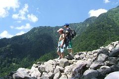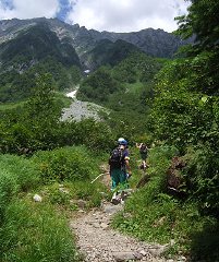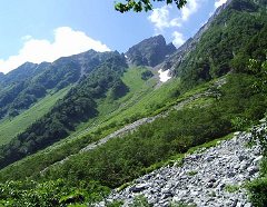 登山道は、上高地から見えるカール(氷河期に氷河によってできた渓谷)を直線的に登るため、岩が多く、変化には乏しいですが、途中、天然のクーラーの風穴があり、また、秋にはすばらしい紅葉が見られます。