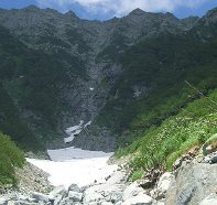 前穂高岳への登山道の方に少し行くと、7〜8月まで雪渓があります。