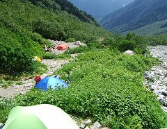 岳沢ヒュッテから右が、井上靖の小説『氷壁』の舞台、前穂高岳への登山道です。重太郎新道と呼ばれる日本アルプス屈指の急斜面で上級者向けコースです。また、左からは西穂高岳方面への登山道です。岳沢ヒュッテで宿泊できないため、テントで寝泊まりする人がいます。下が岩場なので、寝心地は良くないでしょうね。