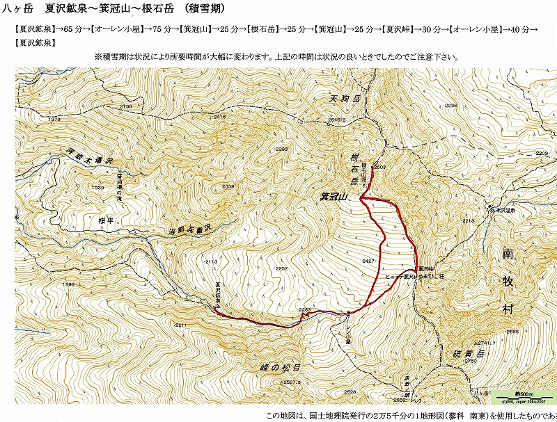 地図 八ヶ岳 夏沢鉱泉〜箕冠山〜根石岳