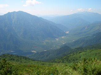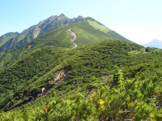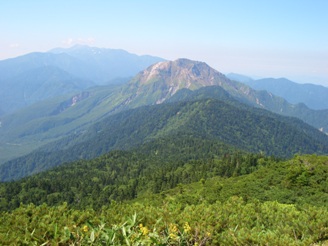 また、独標への道のり、背中にはこの風景。北アルプスの仲間の焼岳、乗鞍岳が背中を後押ししてくれます。