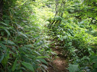 このコースは幅が狭く笹が生い茂っているため歩きにくいこと。笹は濡れていると雪以上に滑るので要注意。