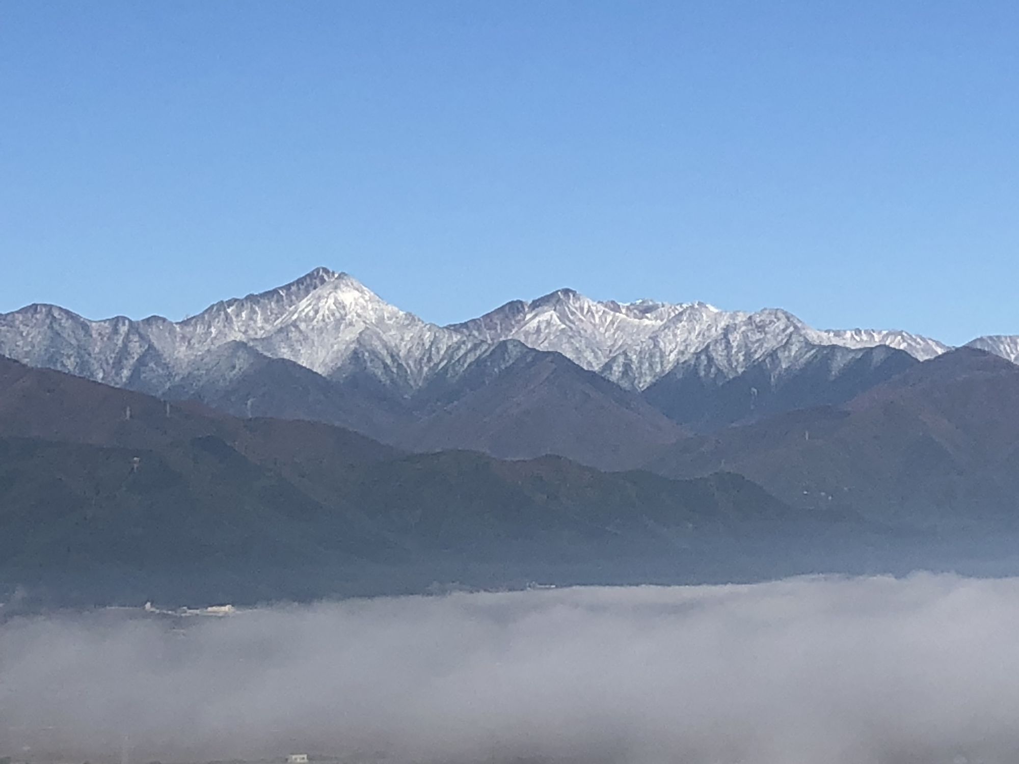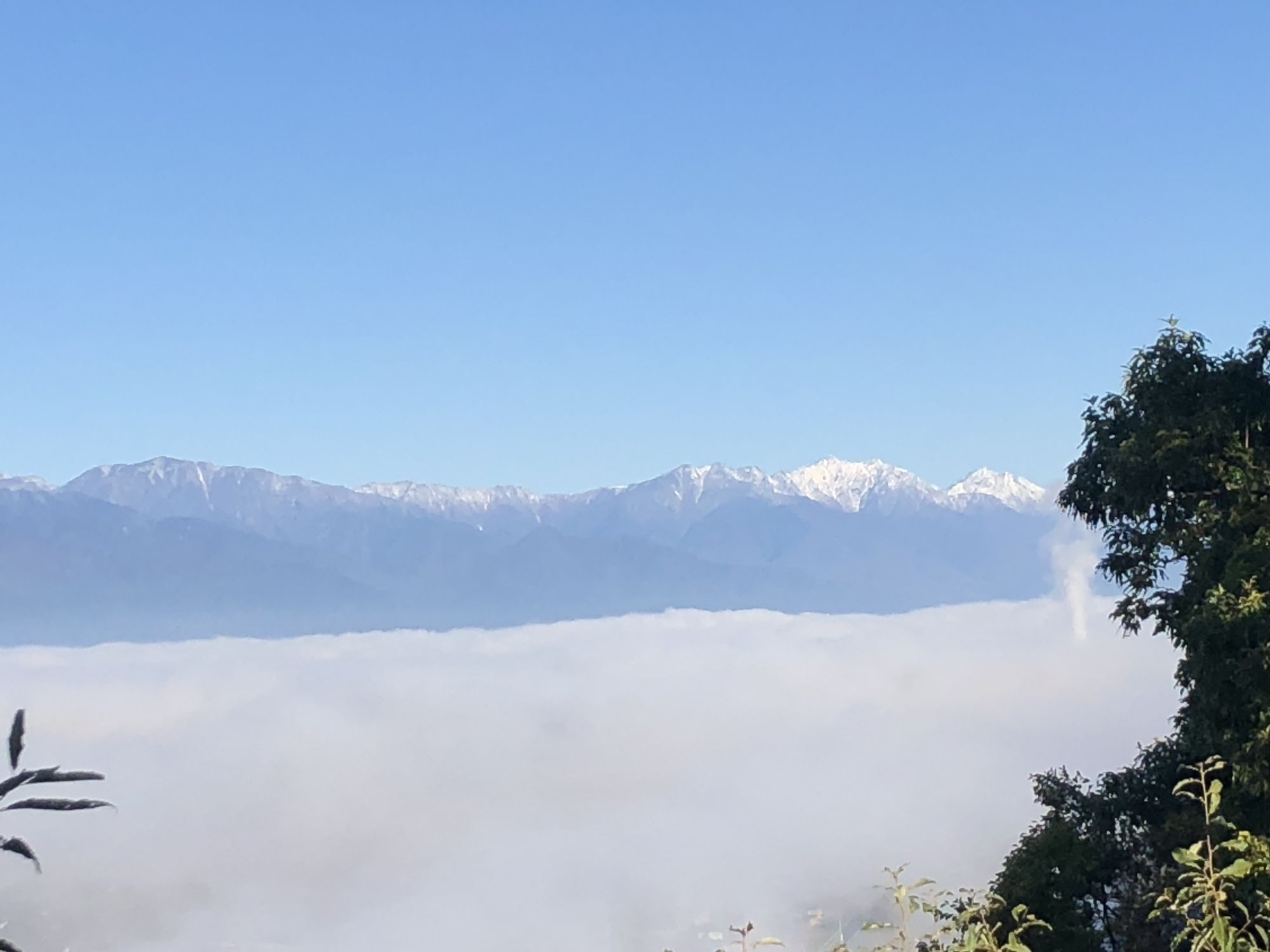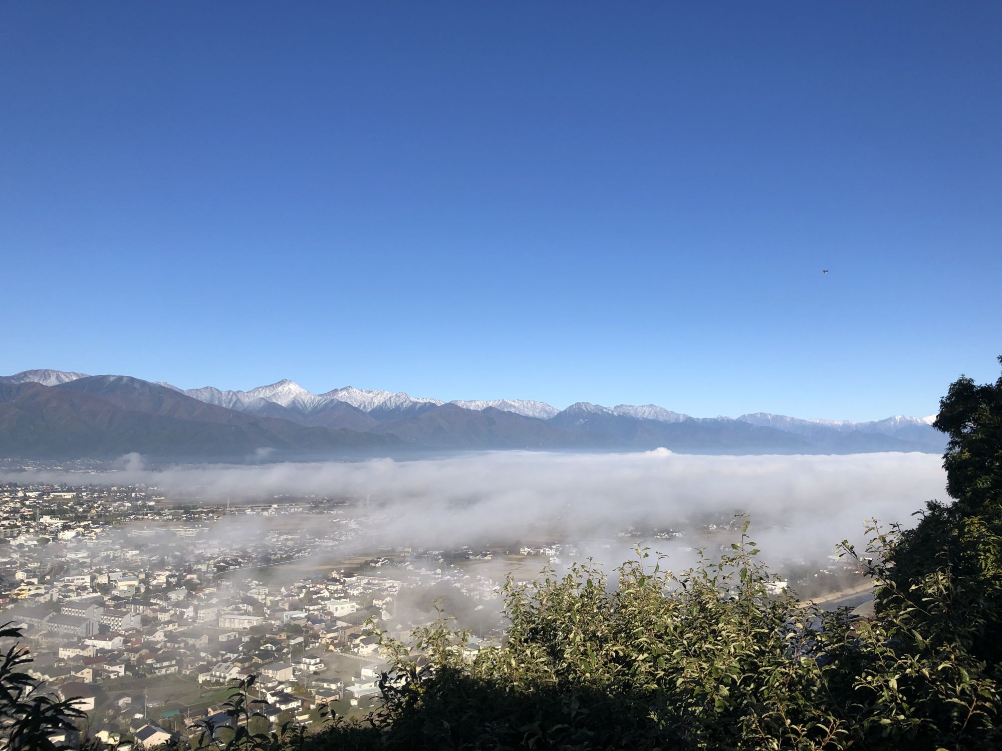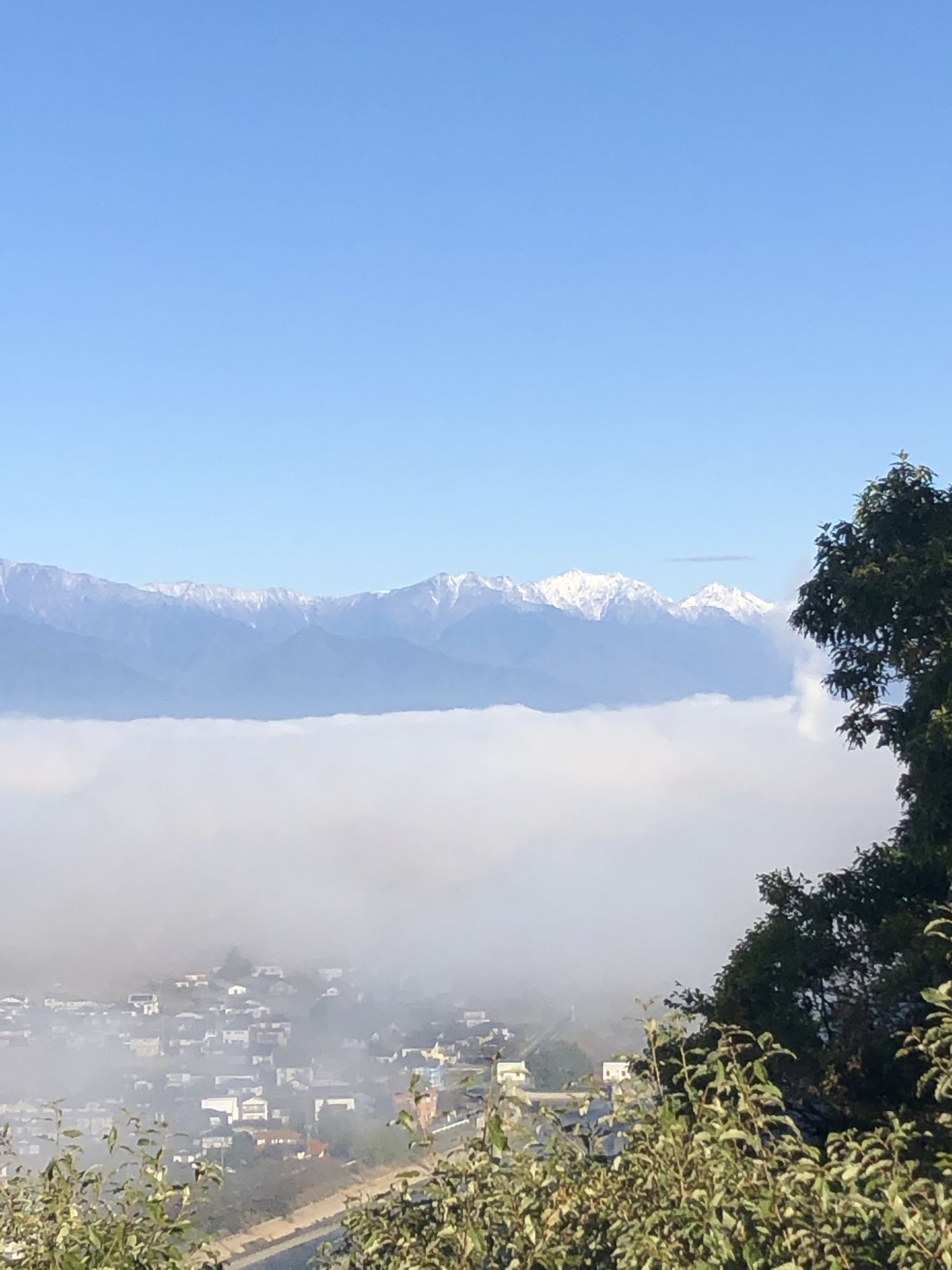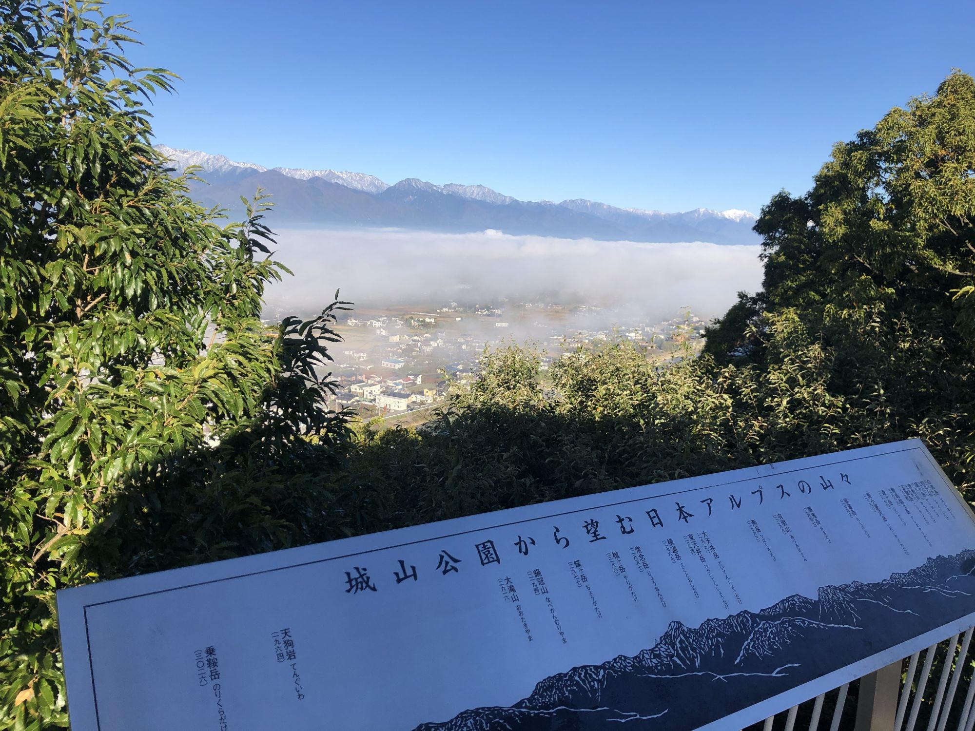 秋天的云海、雪山 周三, 10月 26, 2022 ♥23 昨天(2022.10.24),松本的周围的山上突然戴上了白帽,山上下雪了!日语叫“初冠雪”。 今天一大早,打开窗帘,蔚蓝的天空进入眼帘,突然想登高眺望远山。开车10分钟,到了城山公园。公园虚无一人。沿着樱树路,绕到展望台。 20多蹬螺旋式楼梯后,呈现在眼前的是这番景致!! 城山公园虽以赏樱花而闻名,深秋之际亦能有红叶、云海、雪山!! Tweet