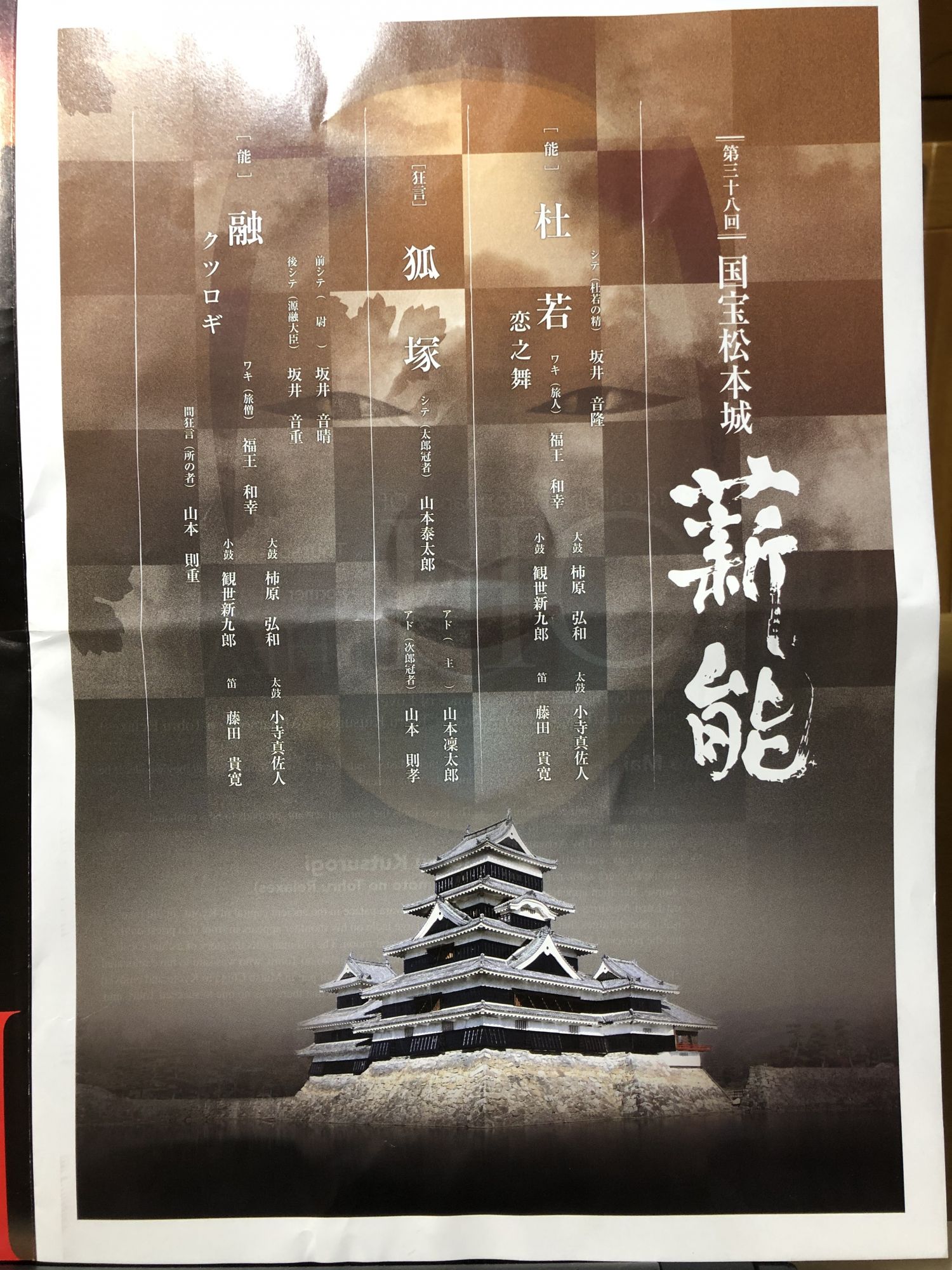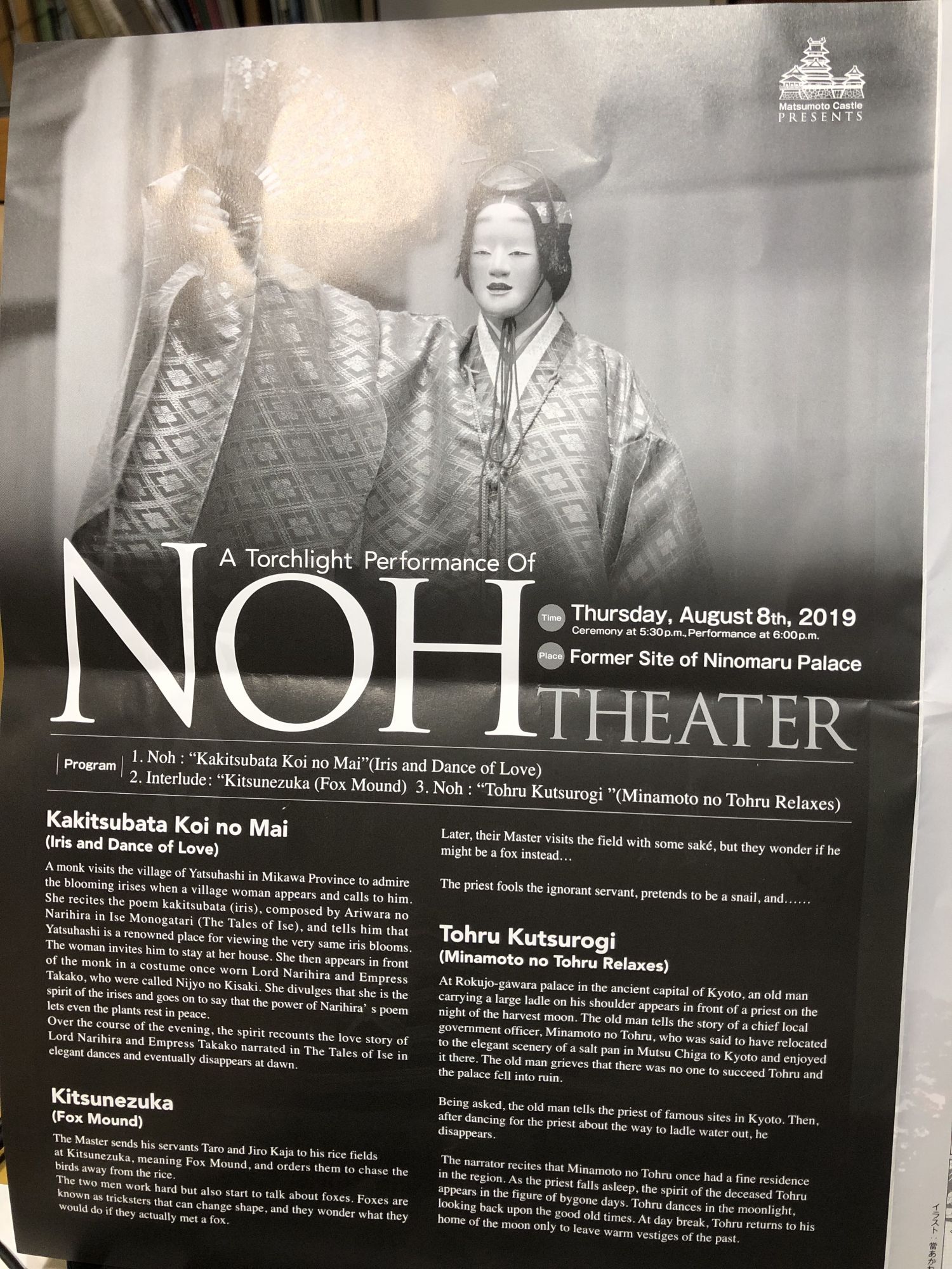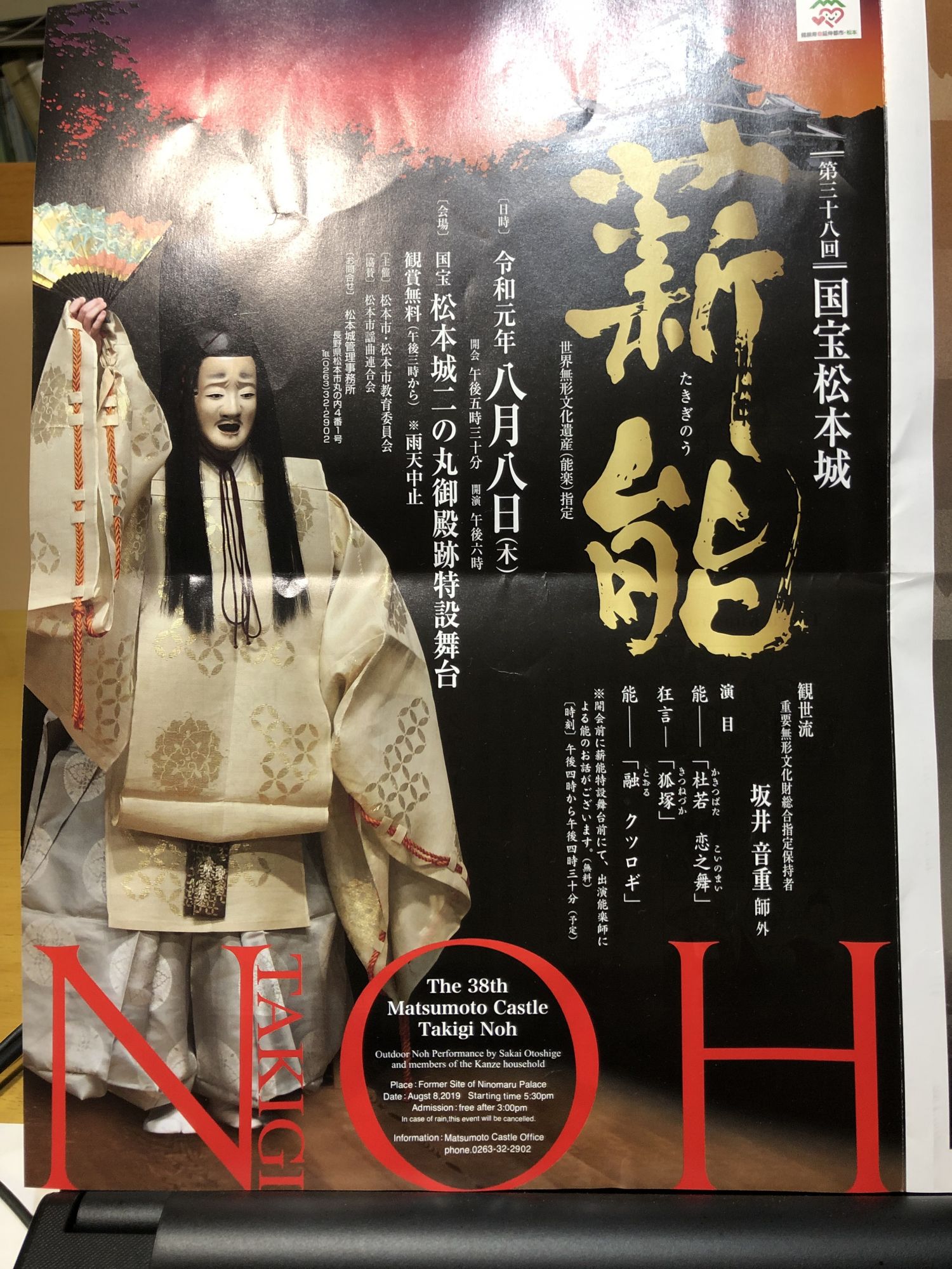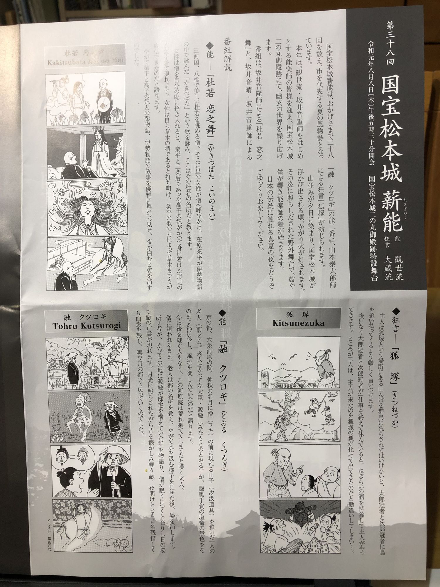 松本城的第三十八次薪能表演 历史 / 季节信息 / 其他 周日, 8月 11, 2019 ♥42 远处映衬着晚霞的阿尔比斯山峰的背景下,松本城前的露天舞台上,鼓笛声伴着能乐师起舞。 宣传册封页 节目表 英文解说 故事介绍 (照片协助者 由冈田忠興先生) Tweet