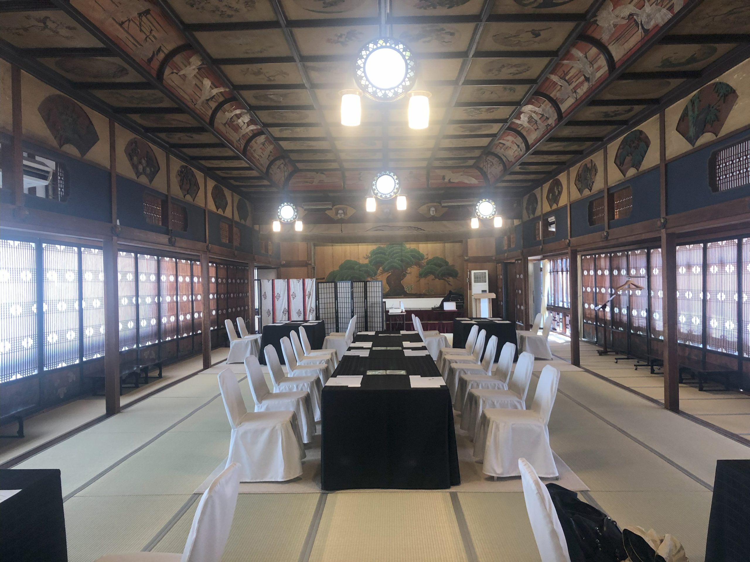 上到二楼,仿佛穿越时光隧道,迎面而来的是精致的天井画与雕刻装饰,是榻榻米房,有桌椅座位,无论是家庭聚餐、商务接待,或是婚宴庆典,都能提供最合适的空间与服务。