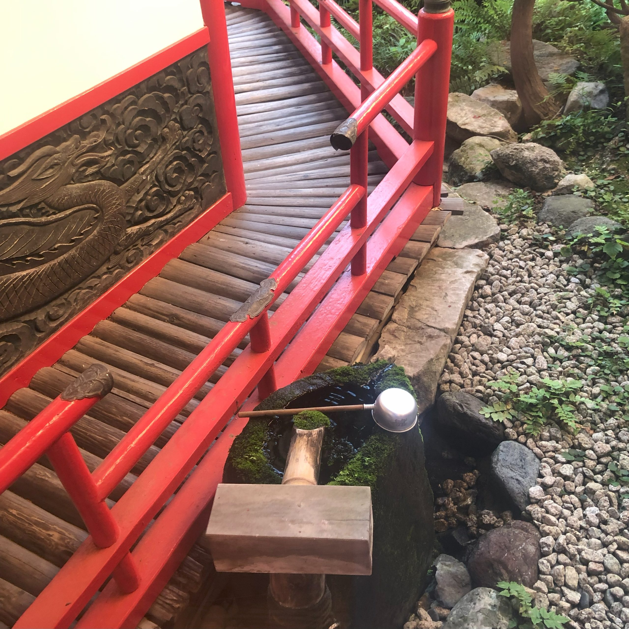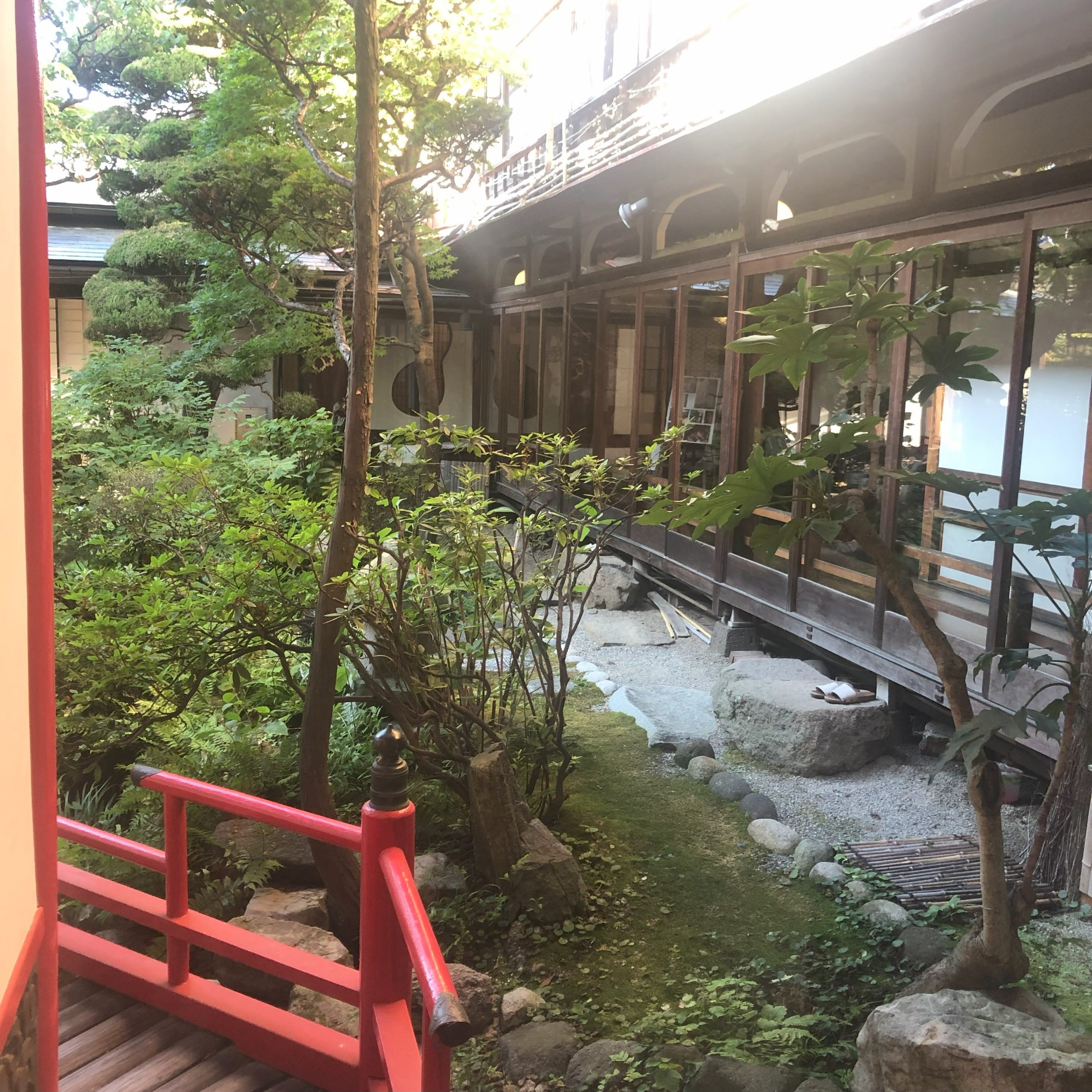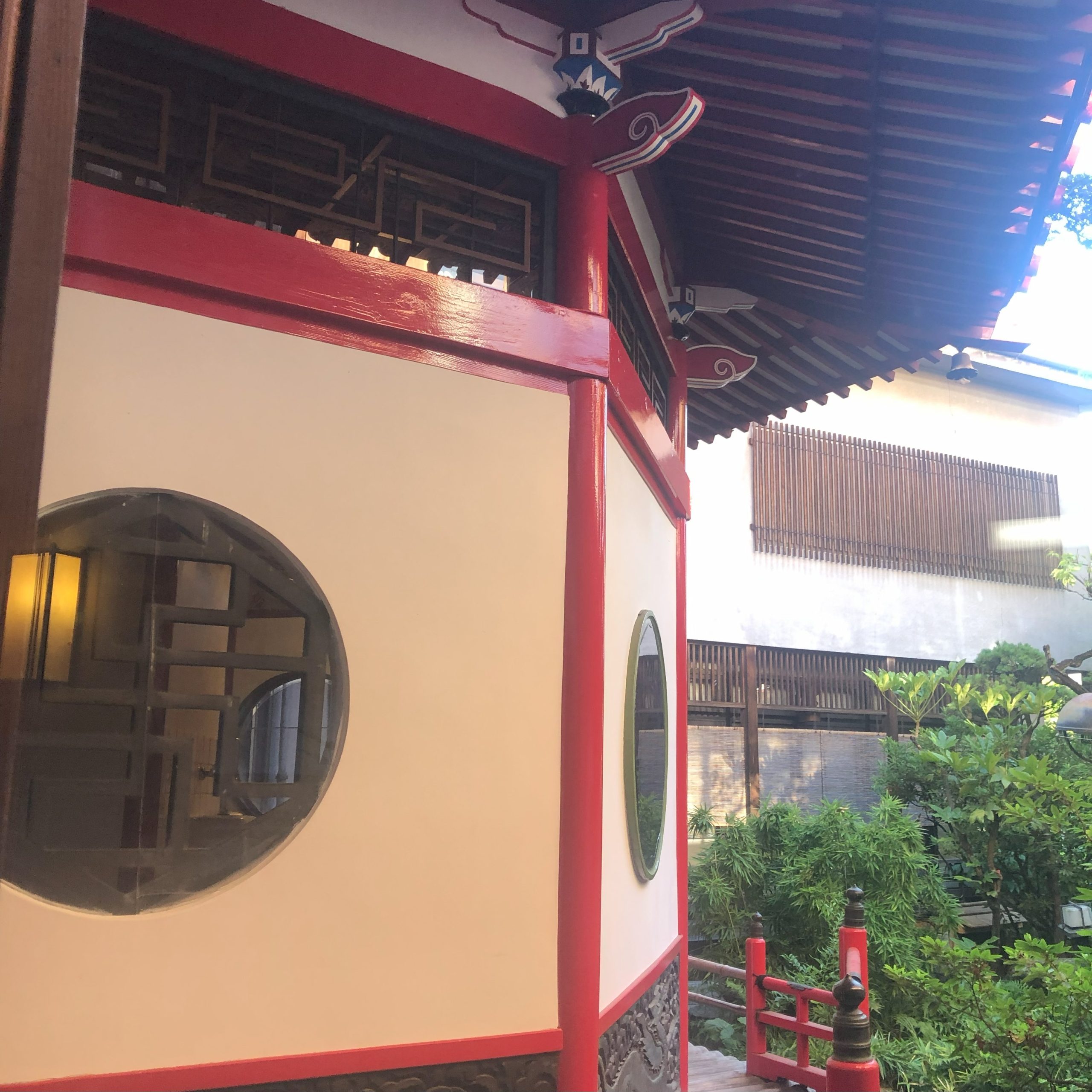 然后跟着店员通过走廊,两方是古色古香的日式庭院和中国风的朱红亭楼。