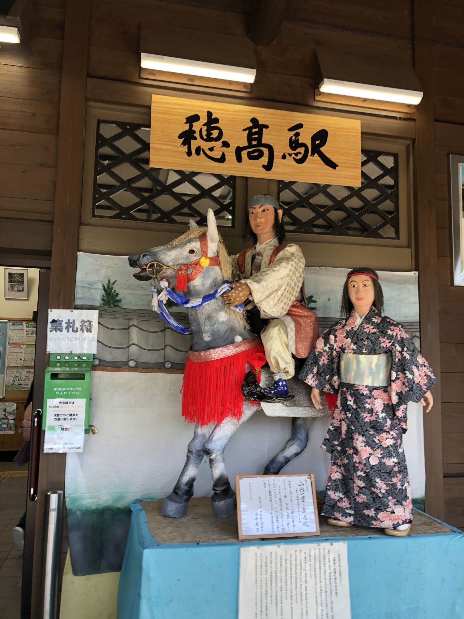 到了我们这次的目的地“白马站”,一下车,迎面有位不速之客前来迎接;白马村的吉祥物“村男三世”!不是常有的什么小动物之类的,而是全身白的不苟言笑的老村民。后来听说那张脸长得和真村长一模一样!