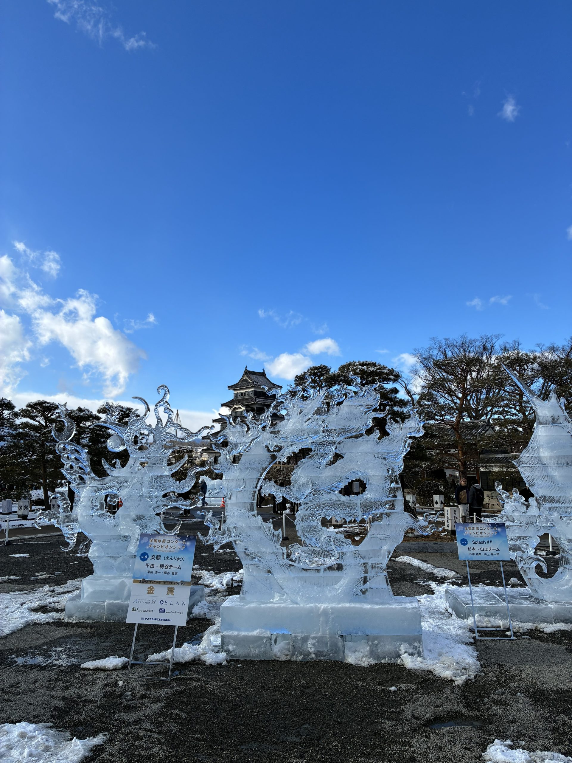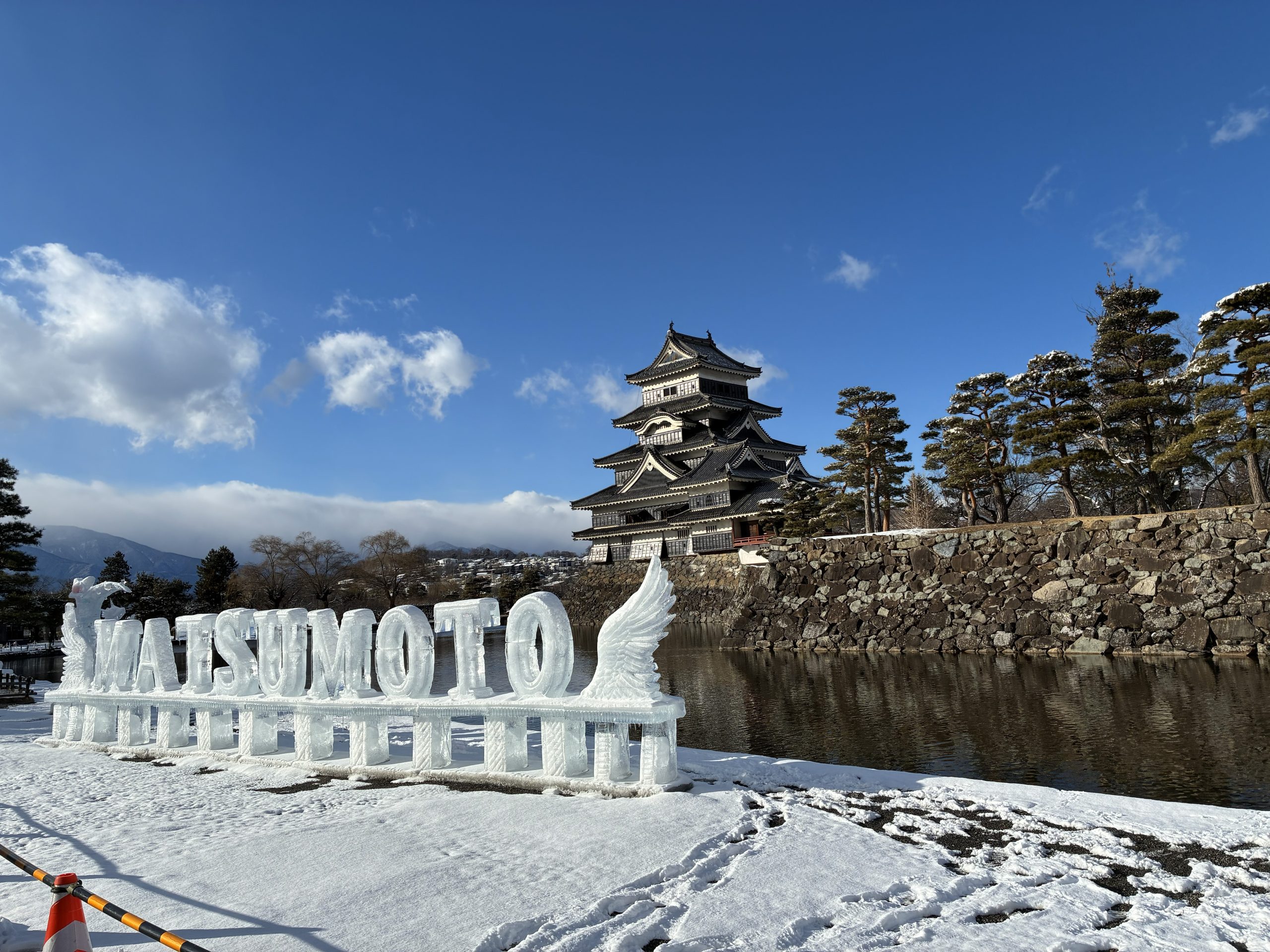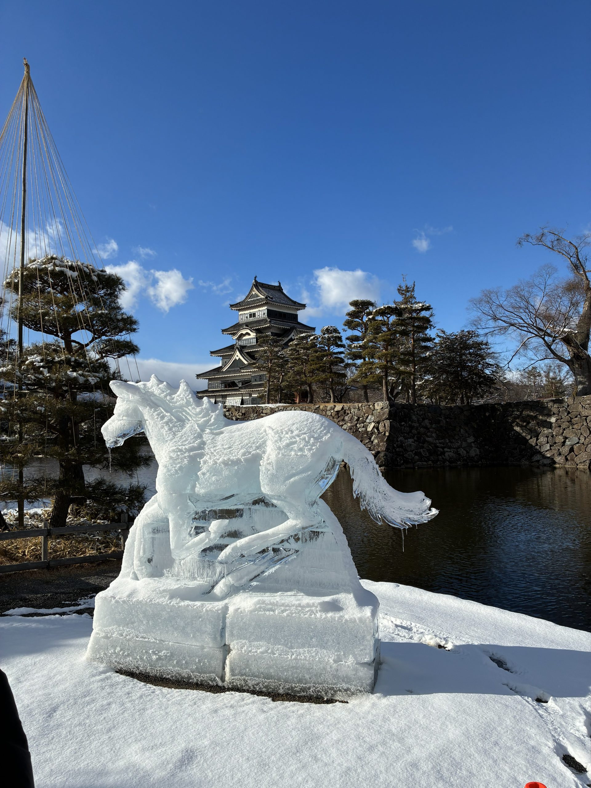 松本所在的长野是日本有名的寒冷地带。这几天有寒流,最低温度到了零下八、九度。但在这严寒之际,却有着独特的活动。首选的当属松本城冰雕节(Matsumoto Castle Ice Sculpture Festival)。