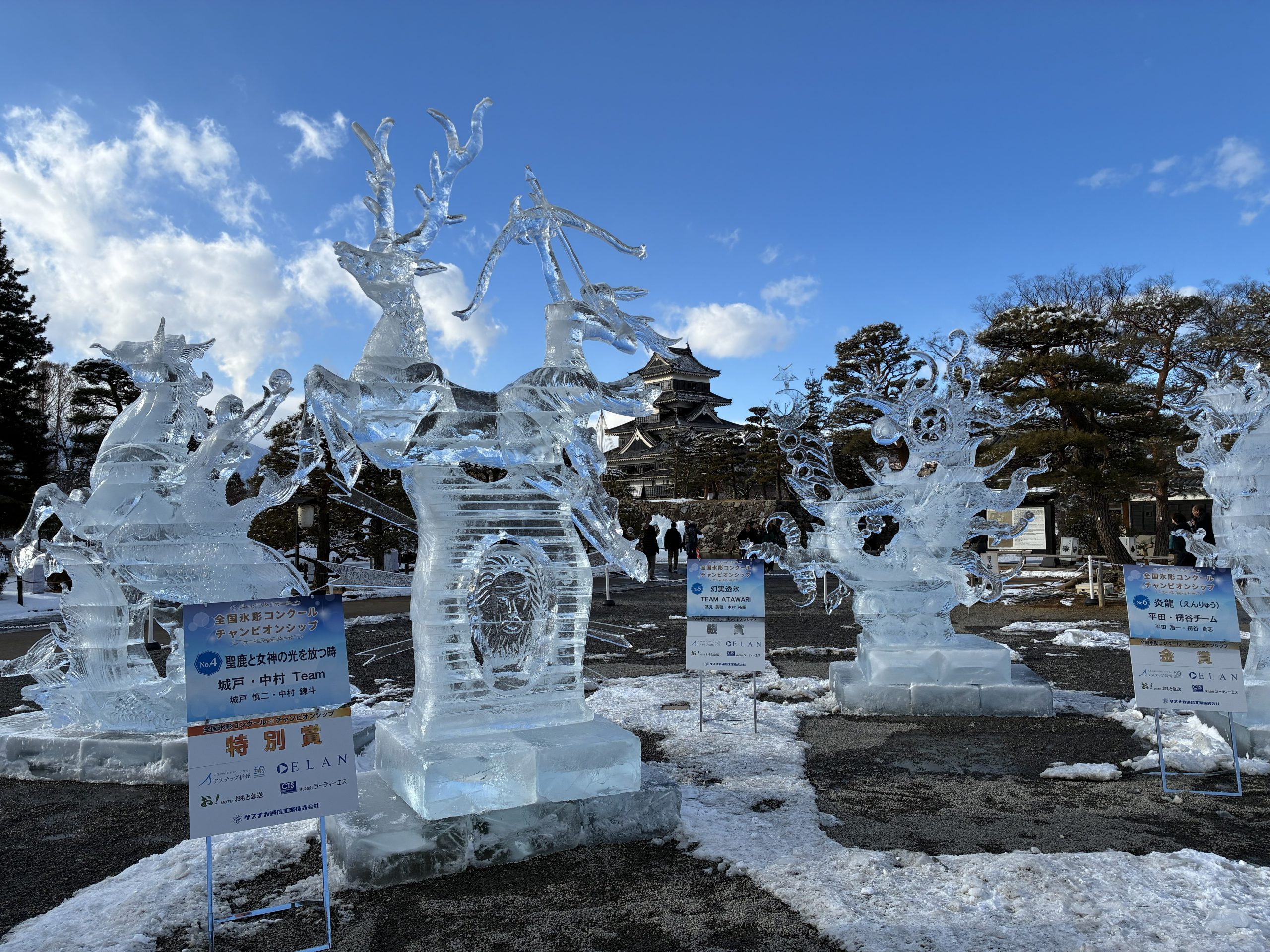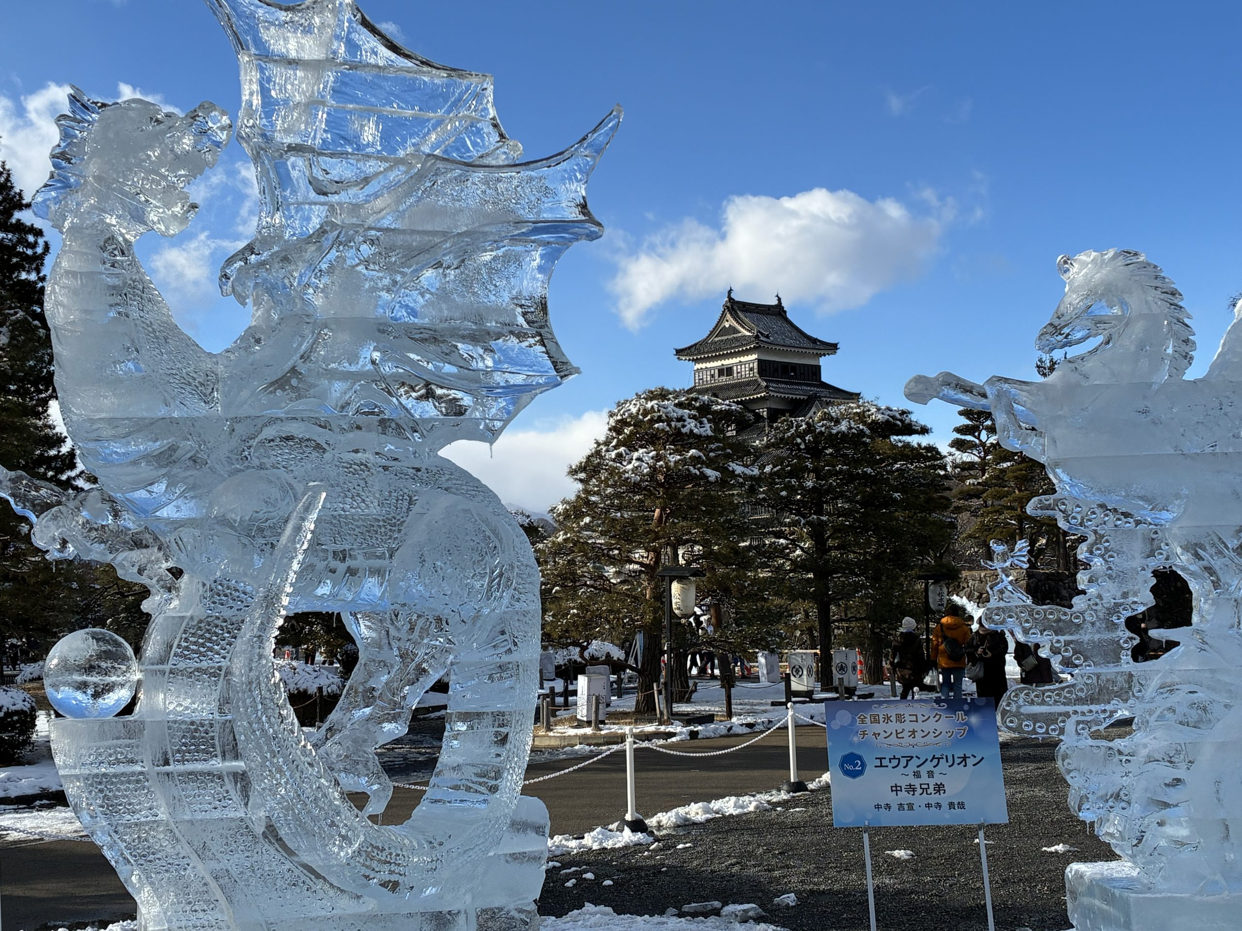 活动的核心是 全国冰雕锦标赛(National Ice Carving Contest Championship),来自日本各地的专业冰雕师齐聚松本,在零下的深夜通宵制作大型冰雕作品。比赛通常从傍晚开始,一直持续到翌日清晨,游客可以看到冰雕师在灯光下挥动电锯、凿刀的壮观场面。完成后的作品会在清晨至下午展出。透明冰雕在天守阁前格外耀眼。